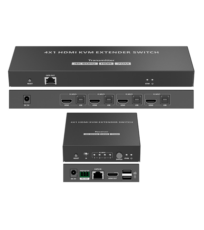 Σύστημα (πομπός + δέκτης) 4K@60 Hz 4x1 HDMI KVM Extender switch. O πομπός διαθέτει 4 εισόδους HDMI και 4 θύρες USB Type-Β για τη σύνδεση με ισάριθμους Η/Υ, καταγραφικά CCTV ή άλλες συσκευές καθώς και μια θύρα RJ45 για τη σύνδεση του δέκτη, μέσω καλωδίου 1 καλωδίου δικτύου Cat6 / 6A / 7, σε απόσταση έως και 70m. Ο δέκτης διαθέτει μια είσοδο RJ45 για το καλώδιο δικτύου, με το οποίο συνδέεται με τον πομπό, 1 έξοδο HDMI για σύνδεση monitor, 2 θύρες USB Type-A για τη σύνδεση mouse και πληκτρολογίου, 1 θύρα RS232, 1 μπουτόν επιλογής και ενδεικτικές λυχνίες. Μέσω του μπουτόν επιλογής ή του συμπεριλαμβανόμενου IR τηλεχειριστηρίου ή την εφαρμογή απλών εντολών στη θύρα RS232 επιλέγεται η 1 από τις 4 συσκευές που συνδέονται στον πομπό ώστε να εμφανίζεται στο τοπικό monitor του πομπού και να γίνεται παρακολούθηση και τηλεχειρισμός της. Υποστήριξη 4K@60Hz, EDID, HDR. Περιλαμβάνονται 2 τροφοδοτικά 230 VAC / 5 VDC, 4 καλώδια USB και βάσεις στήριξης.